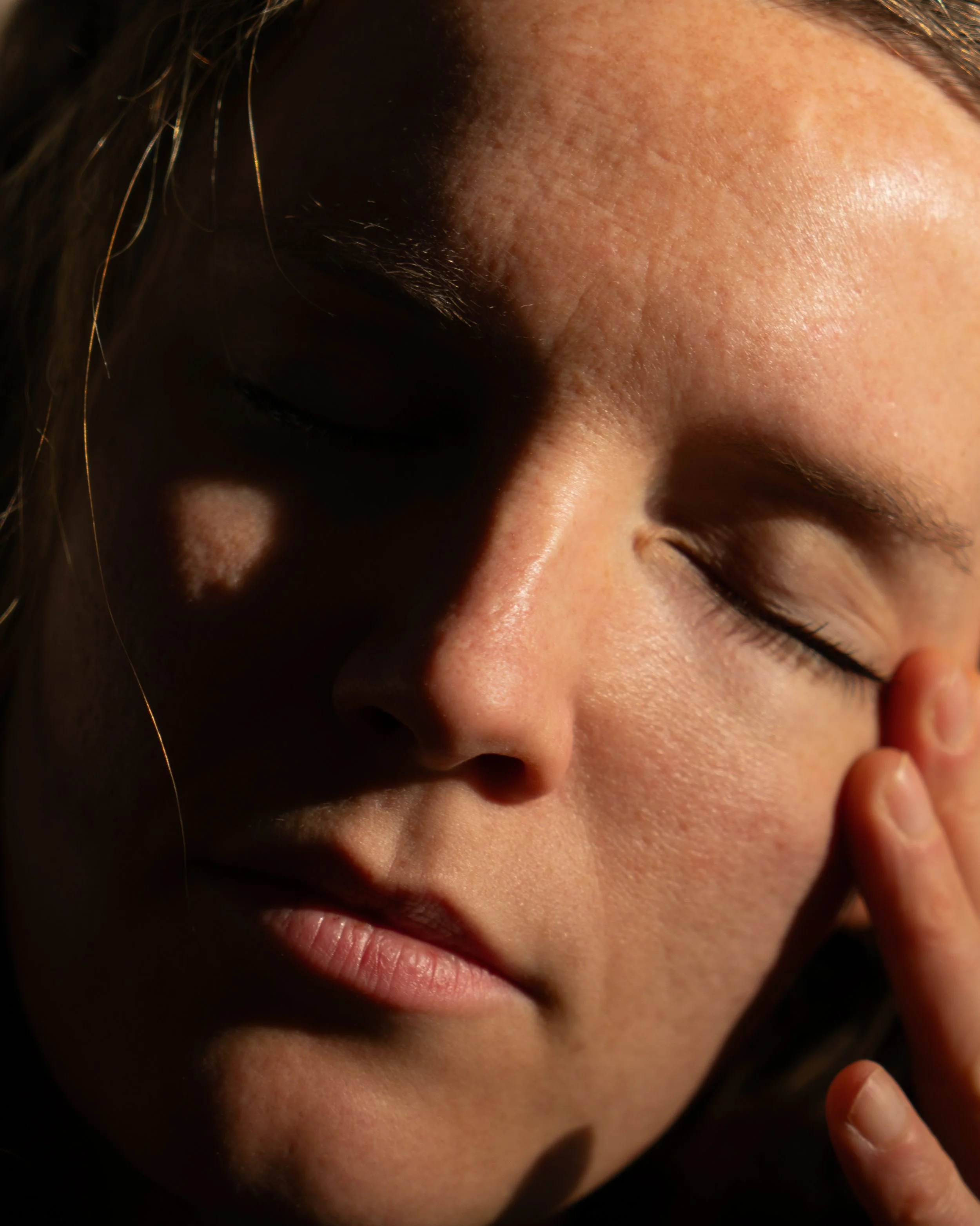 Close-up of a young woman with closed eyes, touching her temple with her fingers, encountering a shadow of a heart shape cast on her face.